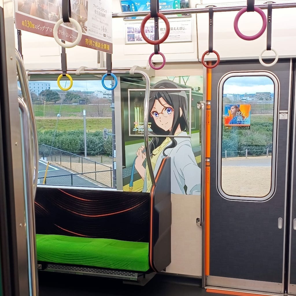 迎えてくれる広告看板を眺めながら聖地を踏みしめつつ、ふと乗ってきた電車の先頭車両車内を一瞥したら…