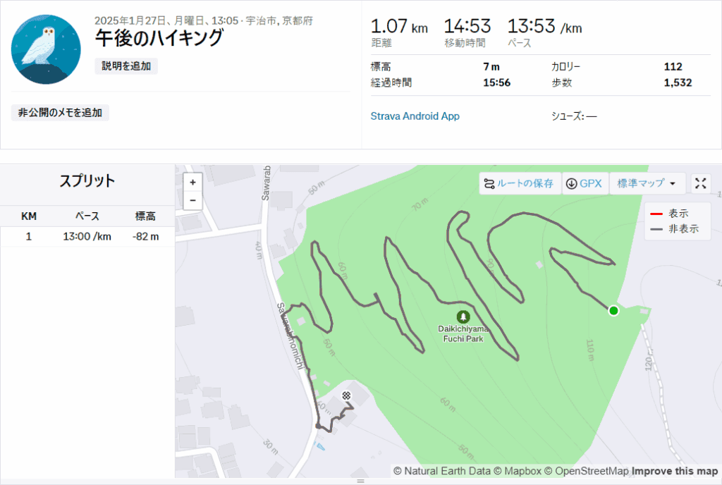 展望台から麓の宇治上神社までログを取ったら、獲得標高は82mでした。