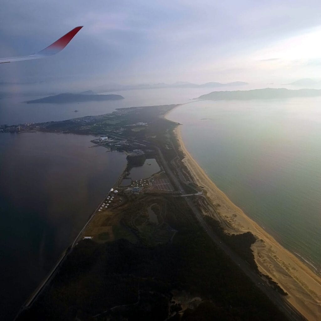 海の中道で大きく旋回して着陸態勢に入りました。