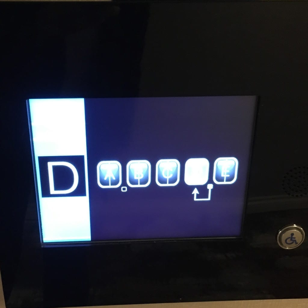 すると、エレベーターホールにある5つのエレベーターのどれに乗るのか案内されます。