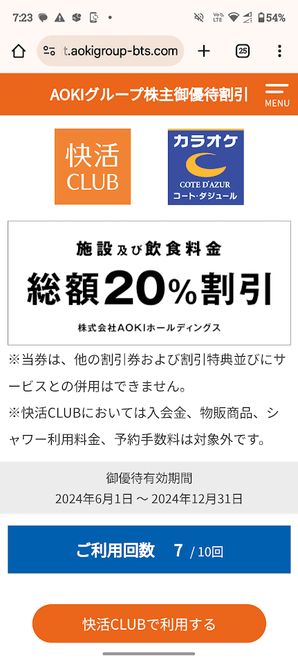 先日の国内旅行の際にも活用した、快活CLUBの株主優待。