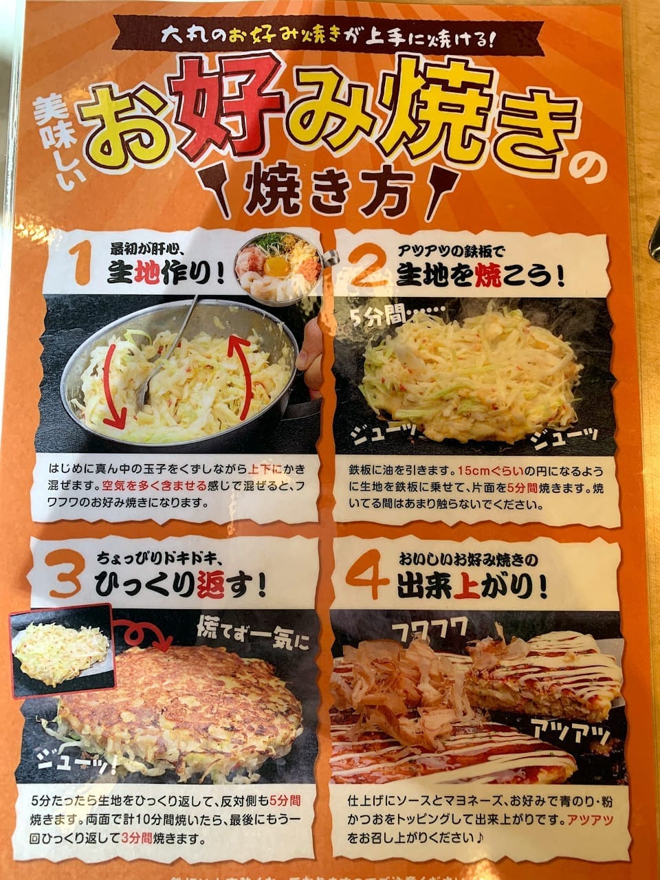 上記の焼き方の手順の1の前に手順0として「豚を先に鉄板で焼いとく」、手順2には「もんじゃのように鏝2本を交互にキャベツを細切れにする」ました。